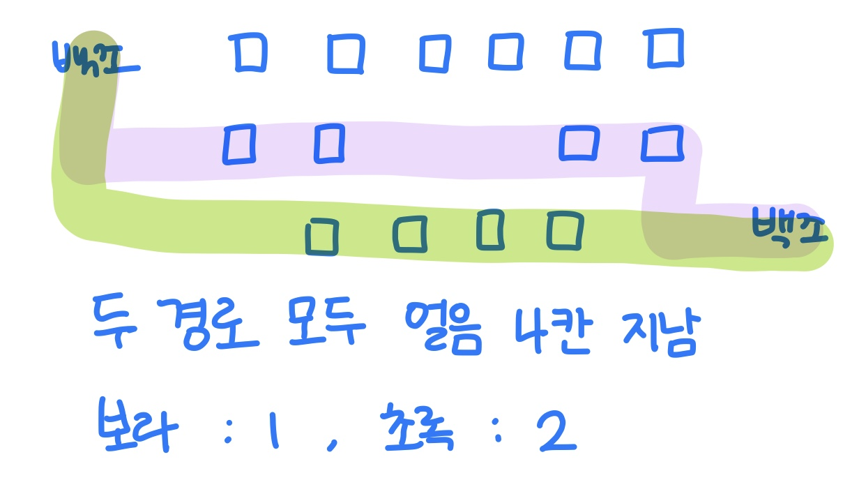 이 때 조건은 얼음을 최대한 적게 지나는 경로다. 그리고 그 경로를 저장해 되돌아 가며 연속된 얼음 개수를 찾는 것이다.