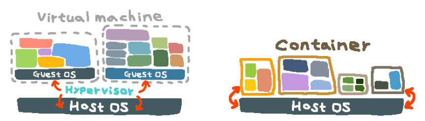 - 컨테이너 : 컨테이너가 실행되고 있는 호스트 OS의 기능을 그대로 사용하면서 프로세스를 격리해 독립된 환경을 만드는 기술이다.