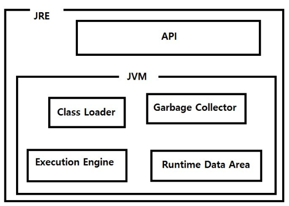 - JRE : Java Runtime Environment 자바 실행 환경 : 자바로 만들어진 프로그램을 실행시키는데 필요한 라이브러리들과 각종 API, JVM이 포함되어 있다. "JRE로 개발은 불가능하고, 실행만 가능하다.