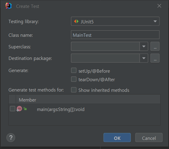 6. 테스트 클래스 파일 이름인 Class name을 입력하고, 아래에 테스트하고자 하는 메소드를 선택한 후 OK 버튼을 누른다.