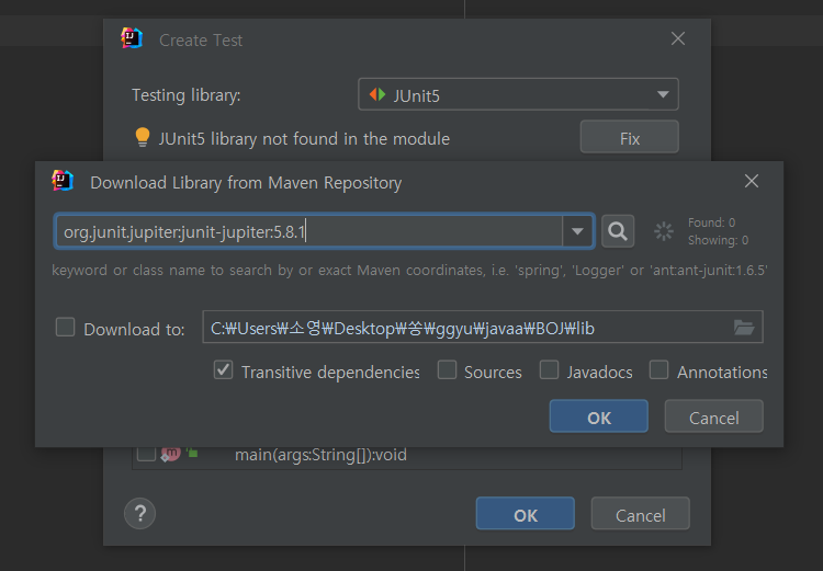 5. Fix 버튼을 누르고 OK 버튼을 누르면 해당 라이브러리 파일이 다운로드 된다.