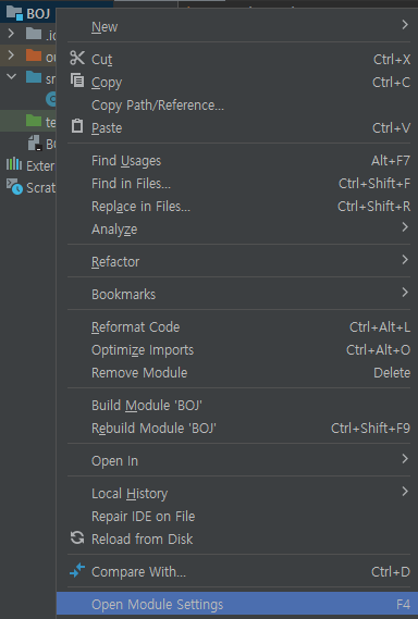 1. 가장 상위 폴더에 test 디렉토리 생성 후 가장 상위 폴더에서 우클릭 -> Open ModuleSettings 를 선택한다.