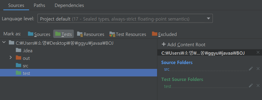 2. test 폴더를 선택한 후 위의 Mark as 에서 Tests를 선택하고 OK를 누른다.