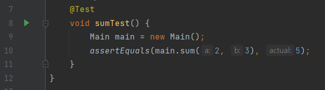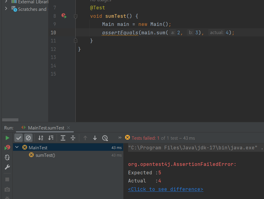 - assertEquals() ; 두 개의 인자 사용 시 같은 값인지 비교, 세 개의 인자 사용 시 테스트를 실패하면 세 번째 인자 메시지를 출력한다.