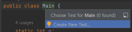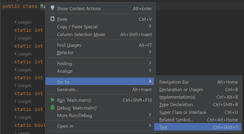 3. 프로그램 작성 코드의 class 이름에서 우클릭 -> Go To -> Test 를 선택한다.