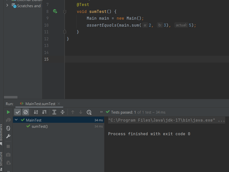 9. 테스트 메소드 왼쪽의 화살표를 눌러 테스트를 진행한다.